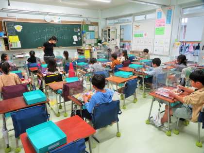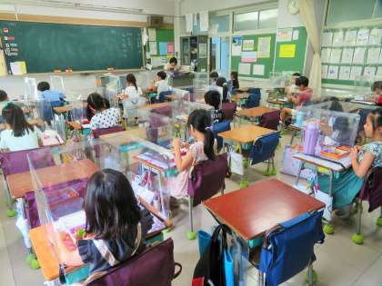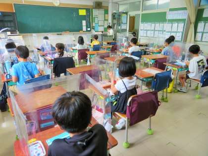 給食弁当を食べている子どもたちに、今日もこっそりインタビューをしてみると、すべての子どもたちが「美味しいです!」と答えていました。教職員も「おかずが多くて美味しいです」と答えていました。本日も、トラブルなく順調でした。