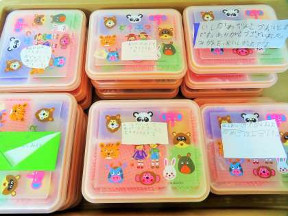 給食弁当を食べている子どもたちに、こっそりインタビューを続けていますが、すべての子どもたちが「美味しいです!」と答えていました。感謝の気持ちを表した、お手紙もありました!