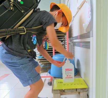 感染症の予防対策として、教室に入る際には、アルコール消毒、「健康観察カード」の提出を徹底しています。