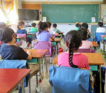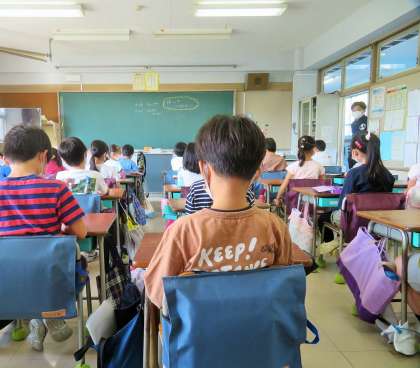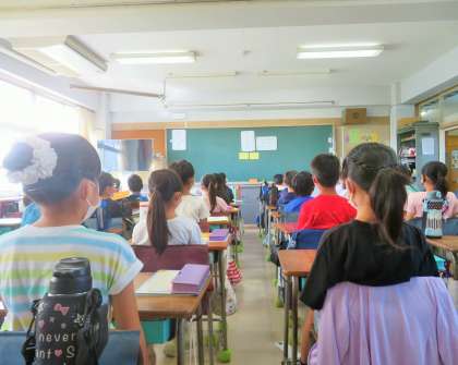写真は、放送朝会を聞いている2年生、2年生、3年生の様子です。