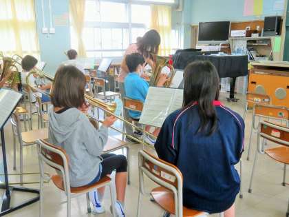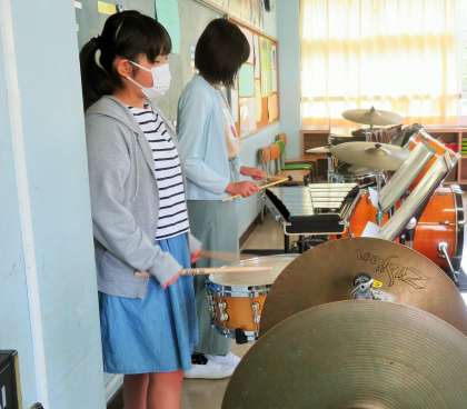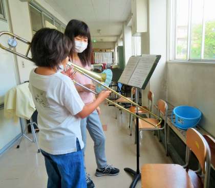 運動会の開会式において「ファンファーレ」、閉会式で「校歌」を演奏予定です。中学生もアドバイスに来てくれました!