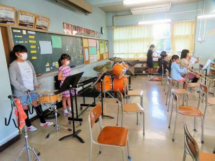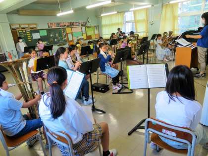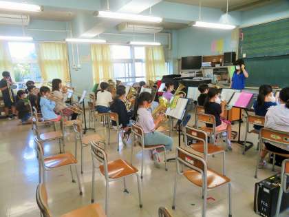 金管バンドの朝練習が先々週から再スタートしています。感染症拡大予防対策を徹底しながら学年単位で練習をしています。本日は4年生の練習です。運動会の開会式において「ファンファーレ」、閉会式で「校歌」を演奏予定です。