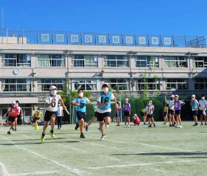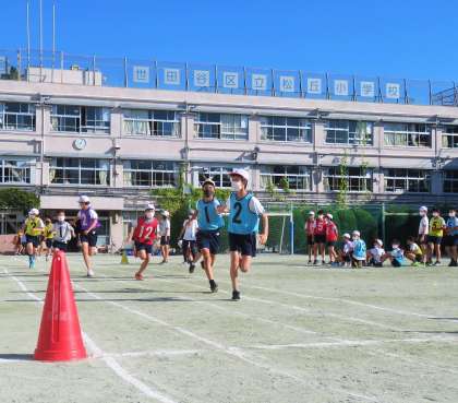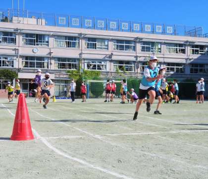 6年生男子によるリレーの朝練習の様子です。バトンを渡す相手とのタイミングが少しずつわかるようになり、リードしてバトンをもらえる選手が増えてきました。回数を重ねることによって上手になっていく様子がよくわかります。