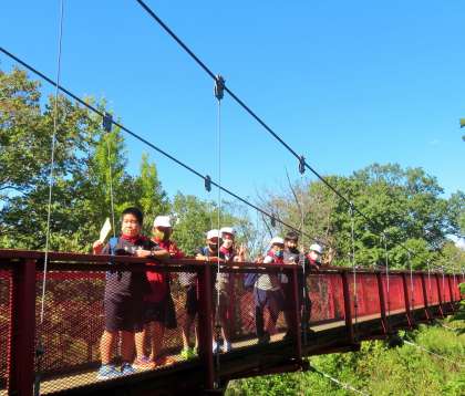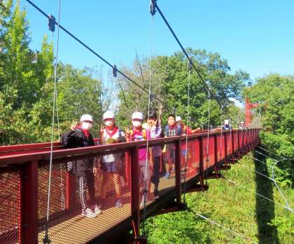 つり橋を渡っています。ゆらゆらゆれて、ちょっとこわいけれど、楽しんでいました!