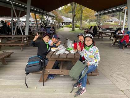 雄大な景色の中での昼食です。おいしいお弁当をありがとうございました。みんな元気です。