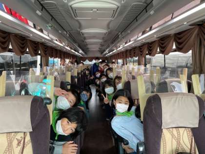 赤城高原サービスエリアに着きました。天候は晴れ、高速道路は順調です。バス車内は、感染症対策として、5分で車内全体が新しい空気に入れ替わる「外気導入運転」を実施しています。また、全席にアクリルボードが装着されています。