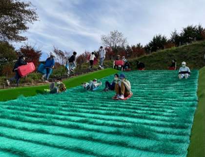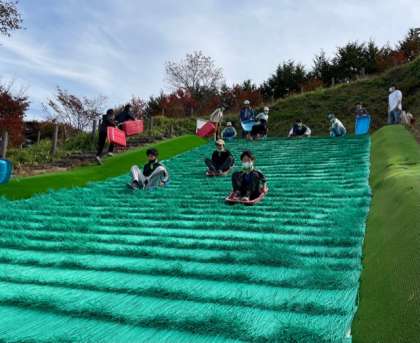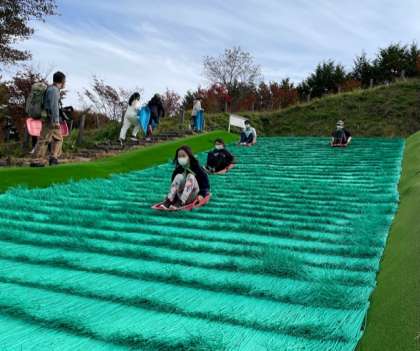 田園プラザの奥にあるプレイゾーンで元気よく遊んでいます。ちびっこゲレンデでは、低い坂と高い坂の芝ソリを楽しむことができます!