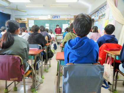 写真は、放送朝会を聞いている6年生の様子です。