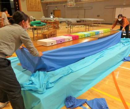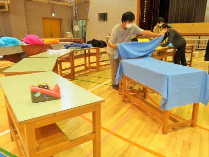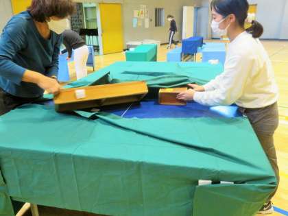 長テーブル、長机、卓球台など、学校にある様々なものを使って、工夫をしながら展示の準備を進めています。