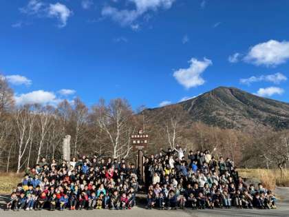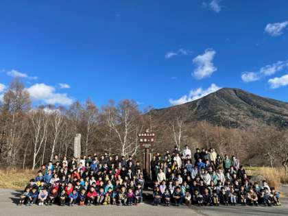 戦場ヶ原の三本松に到着しました。雄大な男体山をバックに学年集合写真を撮りました。これだけ綺麗に見える男体山を、私は初めて見ました!
