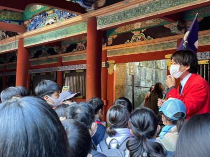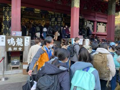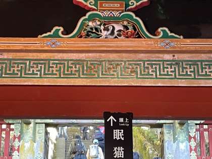 眠り猫の説明、そして鳴龍を見学しました。鳴龍の中は撮影禁止ですが、龍のお顔の下で拍子木を打つと、音が共鳴して、いつまでも鈴のような音が響き渡っていました。