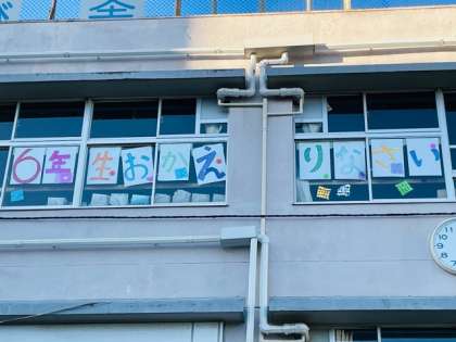 日光林間学園から帰ってきた6年生を「6年生おかえりなさい!」と、お迎えしたのは5年生の子どもたちです。5年生は直接お迎えしたかったのですが、5時間授業で下校時刻を過ぎてしまったため、掲示にて気持ちを表したのです。6年生の子どもたちはもちろん、私たちも疲れが吹っ飛びしました。5年生ありがとう!