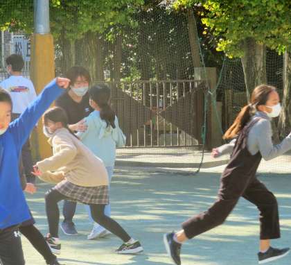 私は3年生と鬼ごっこですが、今日も多くの先生が子どもたちと一緒に遊んでいます!