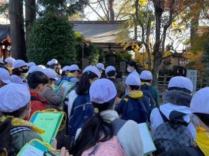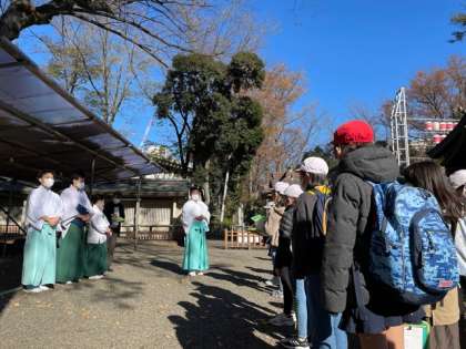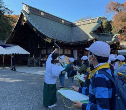 最初の見学地である大國魂神社に到着しました。神主さんから、お庭にある水神社、巽神社、東照宮などに多くの神がまつられている話を伺いました。