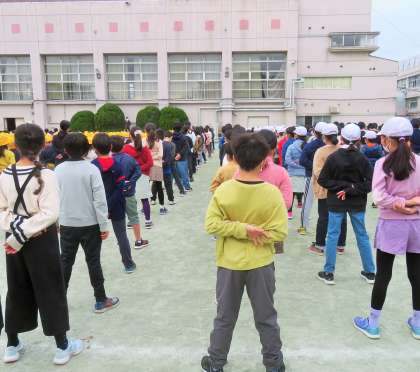 4年生が学校を出発するときに、5年生が「いってらっしゃーい!」と、教室から温かく手を振って見送ってくれました。4年生が学校に帰って来たときにも「4年生おかえりなさーい」というメッセージを窓に掲示するとともに、校庭でもお迎えをしてくれました。
