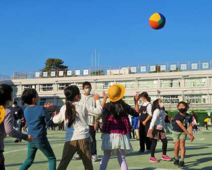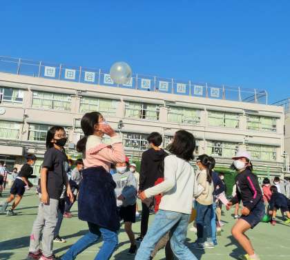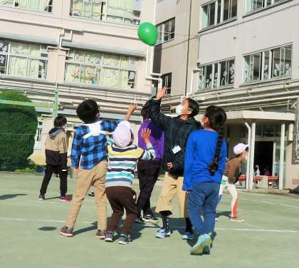 写真は、「風船バレー」をして遊んでいる班の様子です。