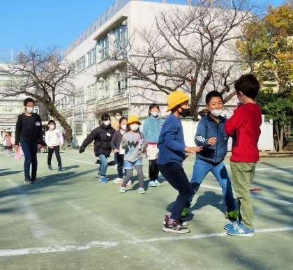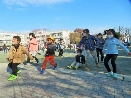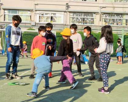 写真は、「だるまさんが転んだ」で遊んでいる班の様子です。