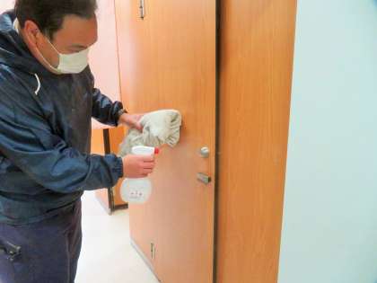 子どもたちの休み時間後、下校後には、主事がトイレ、手すり、ドアノブなどの消毒を行っています。