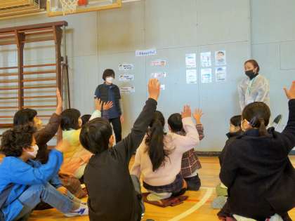 今日は4年生の英語体験出張教室がありました。6名のALTの先生が来校し、3つのシチュエーションをイメージした活動を行いました。シチュエーションは、「病院」、「沖縄への国内線」、そして「学校案内」です。