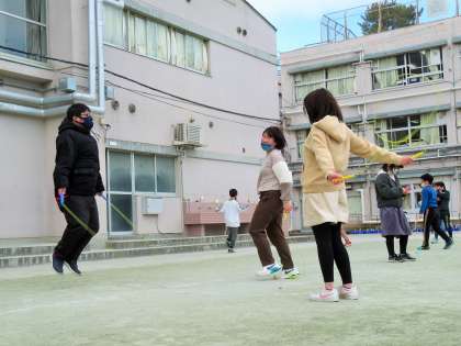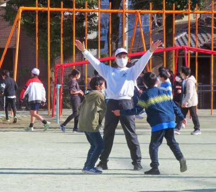 私は5年生と氷鬼で鬼ごっこですが、5年生は速くてすぐに捕まってしまいます。今日も多くの先生が子どもたちと一緒に遊んでいます!