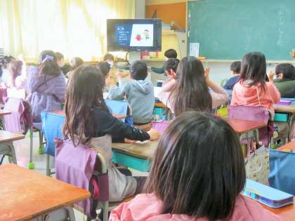 今日の児童集会は集会委員の皆さんによる「節分〇×クイズ」集会です。全校の子どもたちが答えられるように、やさしい問題から難しい問題まで様々でした。教室は、集中した空気に包まれています。