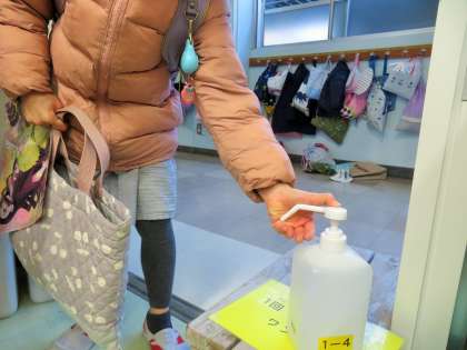 感染症の予防対策として、教室に入る際には、アルコール消毒、「健康観察カード」の提出を徹底しています。