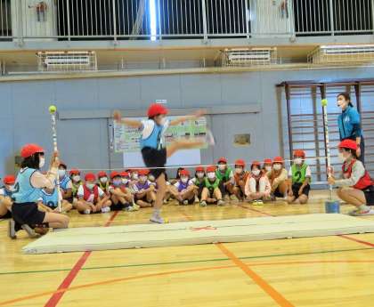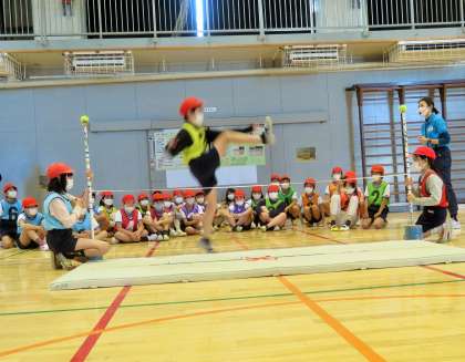 上手に跳べている子の動きを見ながら、ポイントを確認しました。