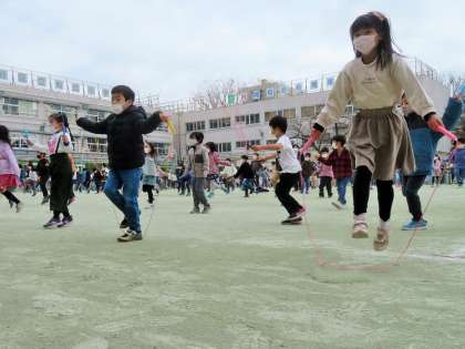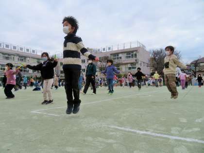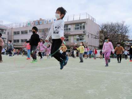 今日の体育朝会は、2・4・6年生の短縄朝会です。先生や運動委員会の子どもたちを手本に「リズム縄跳び」に取り組みました。今日は立春、まだまだ寒い日が続きますが、清々しい汗をかき免疫力もアップです!