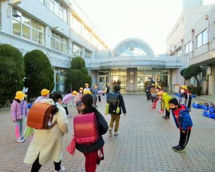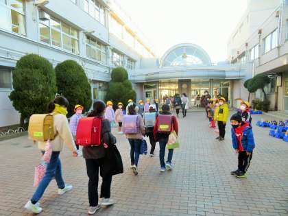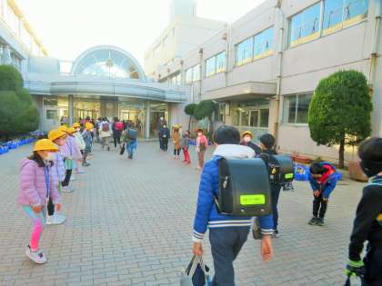 2月の「優郷の学び舎」あいさつ運動は2日目、1年生が担当です。正門と南門に分かれ、登校して来る子どもたちへ気持ちのよいあいさつを投げ掛けてくれています。ソーシャルディスタンスも保たれています。