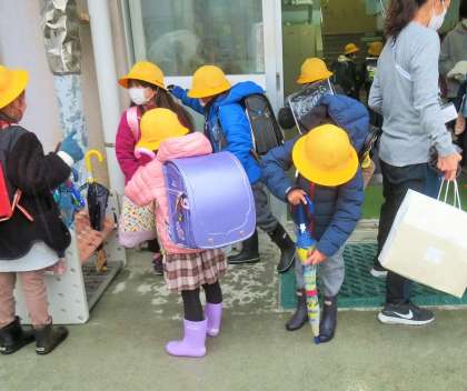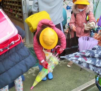 今朝の登校時は、幸いに弱い雨の中での登校となりました。1年生はしっかりと傘をくるくる丸めて傘立てに入れたり、カッパをたたんだりと、自分でできることが確実に増えています。