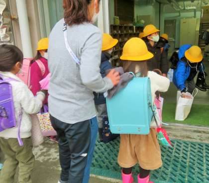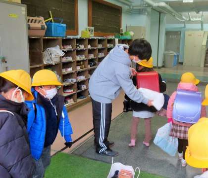 雨の日は、支援員などの先生がタオルを持ちながらお迎えをしています。