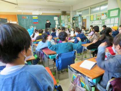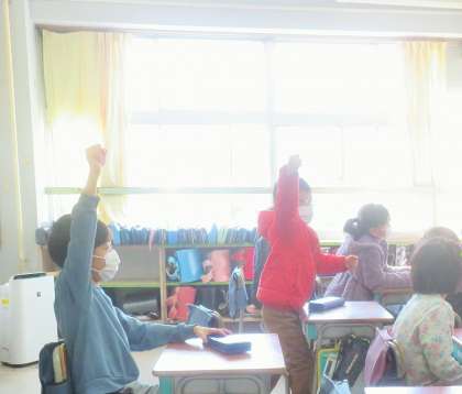 子どもたちは集中して放送に耳を傾けています。クイズに正解すると思わずガッツポーズがでていました。