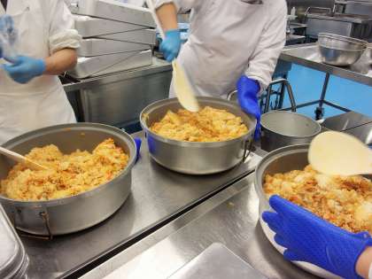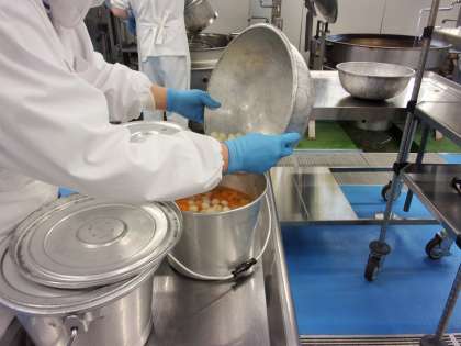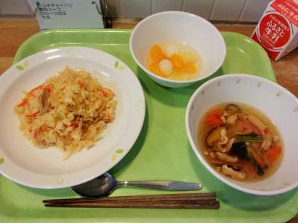 今日は、3組からリクエストのあった「キムチチャーハン」と全クラスからリクエストのあった「フルーツポンチ(フルーツ白玉)」です。