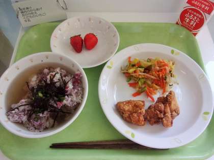 今日は、6年生の全クラスからリクエストのあった「梅茶漬け」と2組からリクエストのあった「鶏肉のからあげ」です。