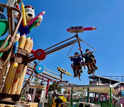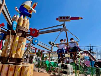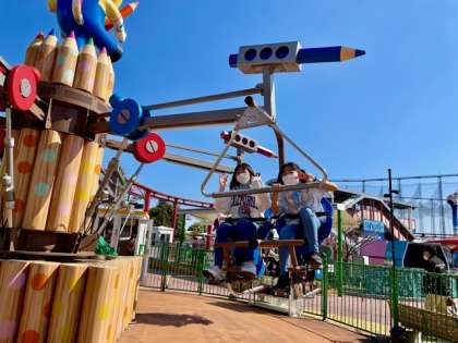 コンパスと色鉛筆の見た目がかわいらしい回転型のアトラクション。座席のペダルをこぐとライドが上昇する「くるくるコンパス」です!
