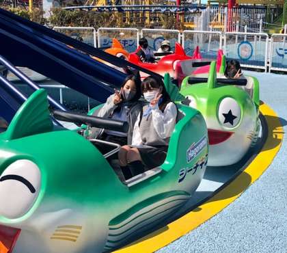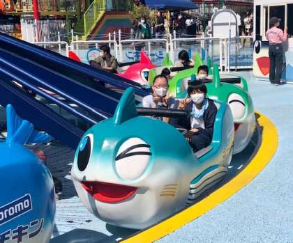 カラフルな「シーチキン号」が空中をくるくると回転するアトラクション。手元のボタンで上昇下降を自分で操作することができます。