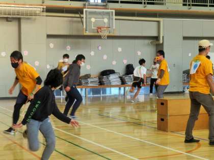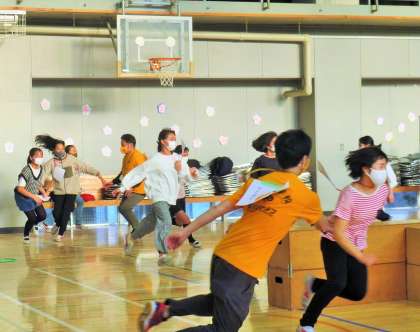 子どもたちは「校長先生からの挑戦状」として、3つのゲーム「ドロケイ」「謎トレ」「バラマキクイズ」に挑戦しました。