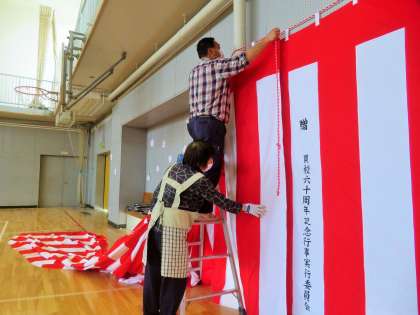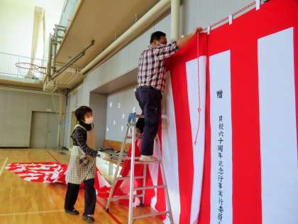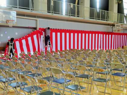 主事室総出で体育館の紅白幕をはりました。これで体育館がすっかり卒業式の雰囲気に変わりました。卒業式の練習、会場の準備等、いよいよ本格的になってきました。