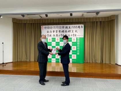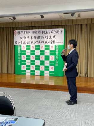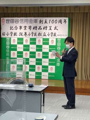 世田谷信用金庫が創立100周年、その記念事業の一環として松丘小学校に、以下の物品を寄贈していただきました。本日は、目録の贈呈式が開催されました。私たちが欲しくても購入できなかった、高価で貴重な品をありがとうございました。