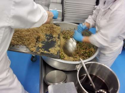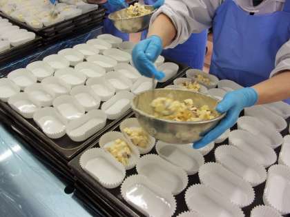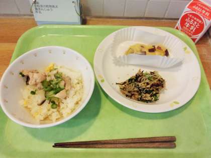 給食では、ごはんに炒り卵を混ぜ、鶏ガラスープに鶏肉やしいたけを入れて作りました。