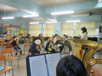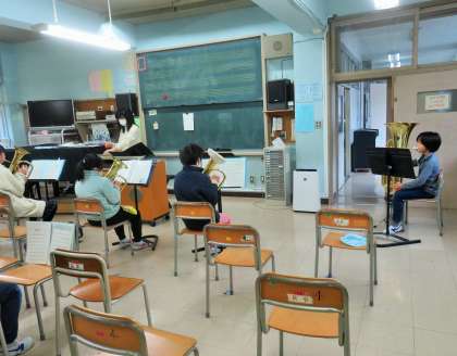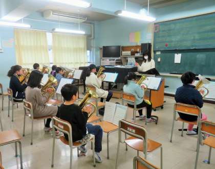 金管バンドの朝練習は、新たな部長、副部長を中心に新体制でスタートしています。今後の目標は、4月の「1年生を迎える会」です。