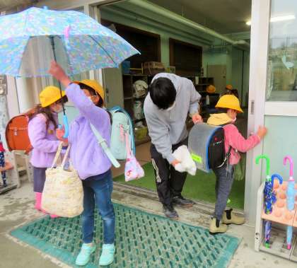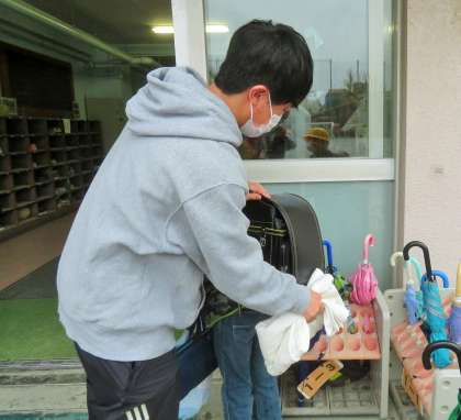 雨の日は、支援員などの先生がタオルを持ちながら、温かく迎えています。