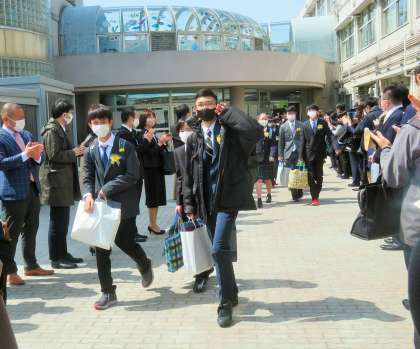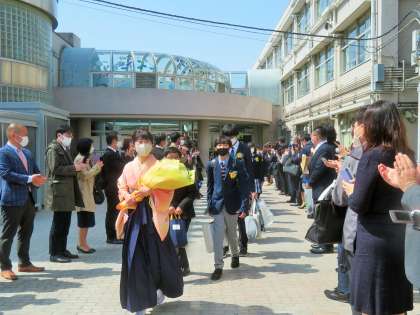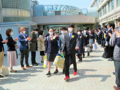 校庭に花道をつくり、教職員と保護者の皆さんで卒業生を送り出しました。