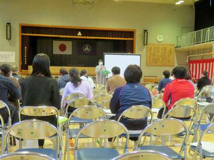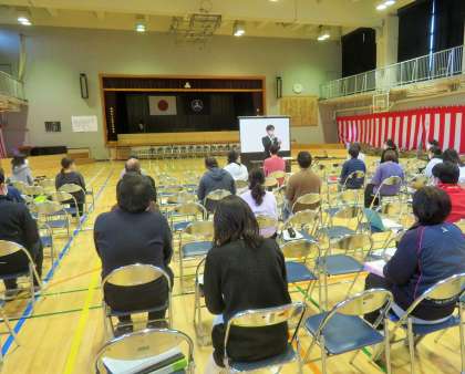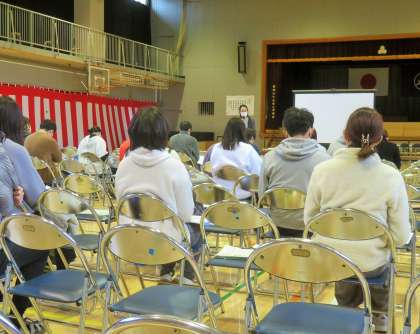 写真は、職員会議の様子です。蜜を避けるために、体育館で行っています。