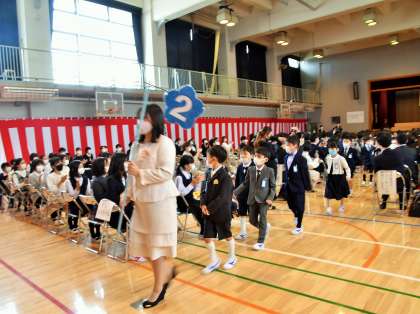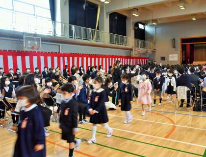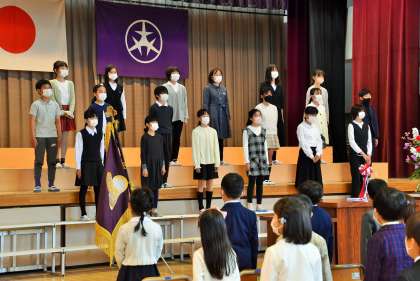 「校歌斉唱」は、6年生の合唱団が心を込めて歌いました。式場には、美しい歌声が響いていました。6年生の皆さん、ありがとう。1年生も明日から、少しずつ歌って覚えてほしいと思っています。