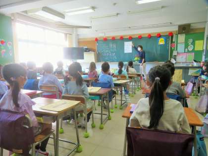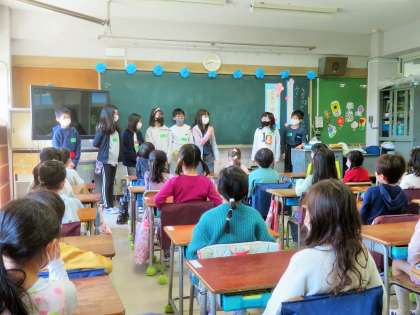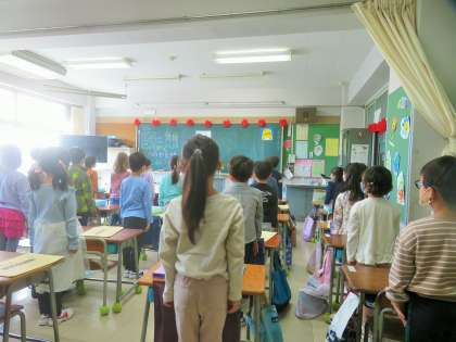 1年生の朝の会では、姿勢正しくあいさつをしたり先生の話を聞いたりすることができています。