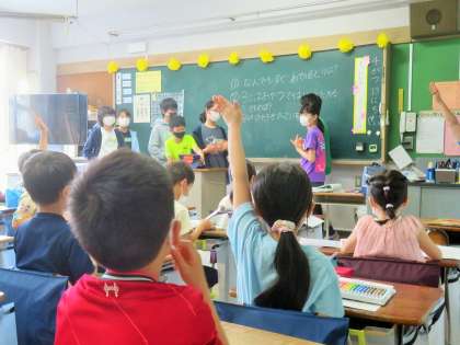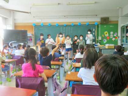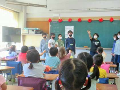 1年生を和ませようとクイズを出しています。最後は「ありがとうございました。また来てください!」と、あいさつをしてお別れします。6年生、いつもありがとう!