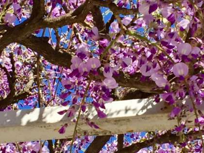 写真は、先日撮影した校長室前の藤棚です。藤の花が美しく咲いています!