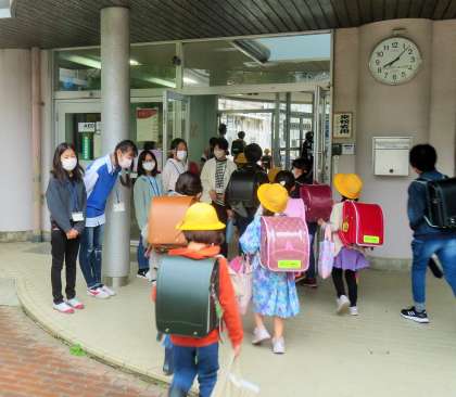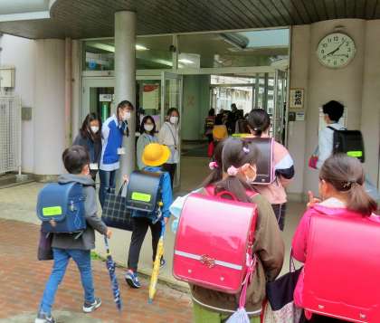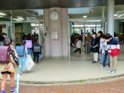 今年度初めての「優郷の学び舎」あいさつ運動1日目です。小雨がぱらついていたため、庇の下や昇降口でのあいさつ運動です。登校して来る子どもたちへ、気持ちのよいあいさつを投げ掛けてくれています。