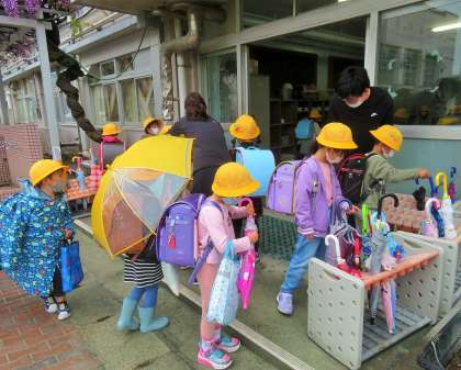 1年生は、傘をくるくる丸めて傘立てに入れたり、カッパをたたんだりと、自分でできることを増やそうとがんばっています。
